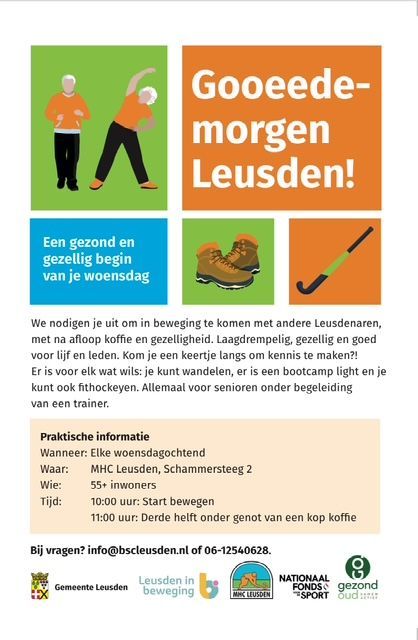 Gooeedemorgen Leusden is een initiatief van MHC Leusden, Leusden in beweging, gemeente Leusden, Gezond Oud en het Nationaal fonds voor de sport.